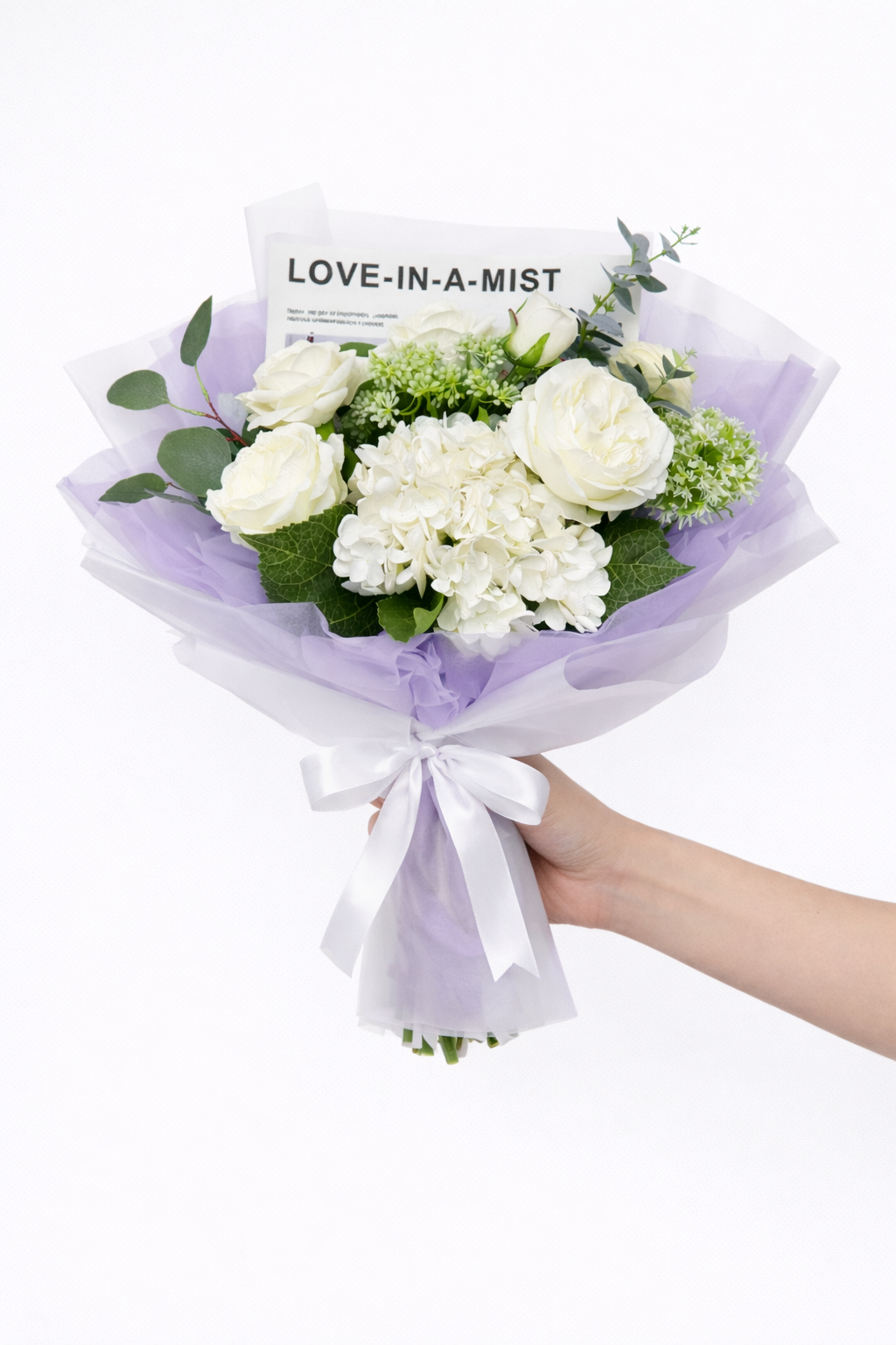 Быстро сборная упаковка в пленке. Форма №2 Коллекция "ГЛАМУР". Цвет: МАТОВАЯ пленка с СИРЕНЕВОЙ тишью. размер букета: h-50