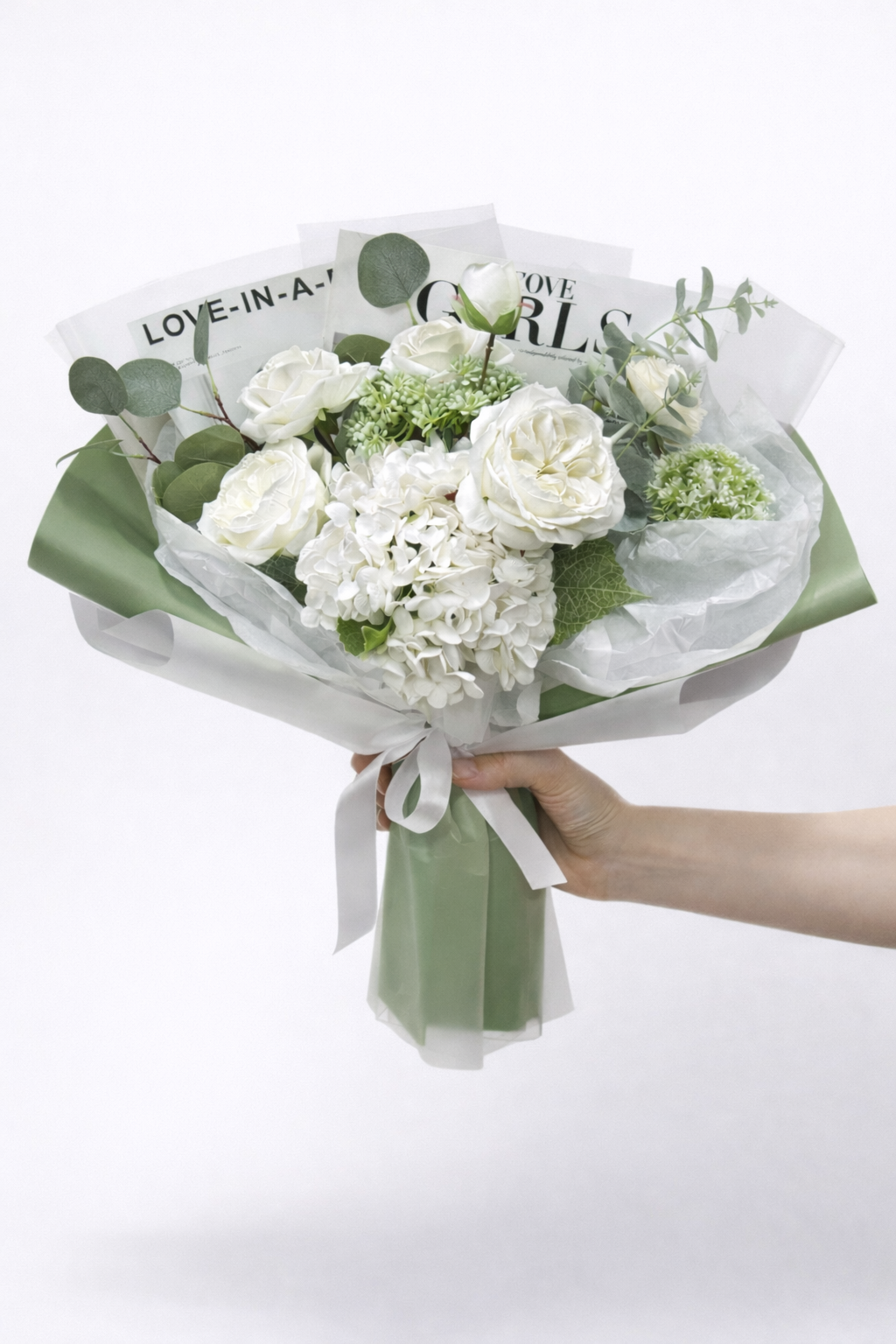 Быстро сборная упаковка в пленке. Форма №4 Коллекция "Гламур". Цвет: ОЛИВКОВЫЙ. Размер букета: +/- в55, ш50