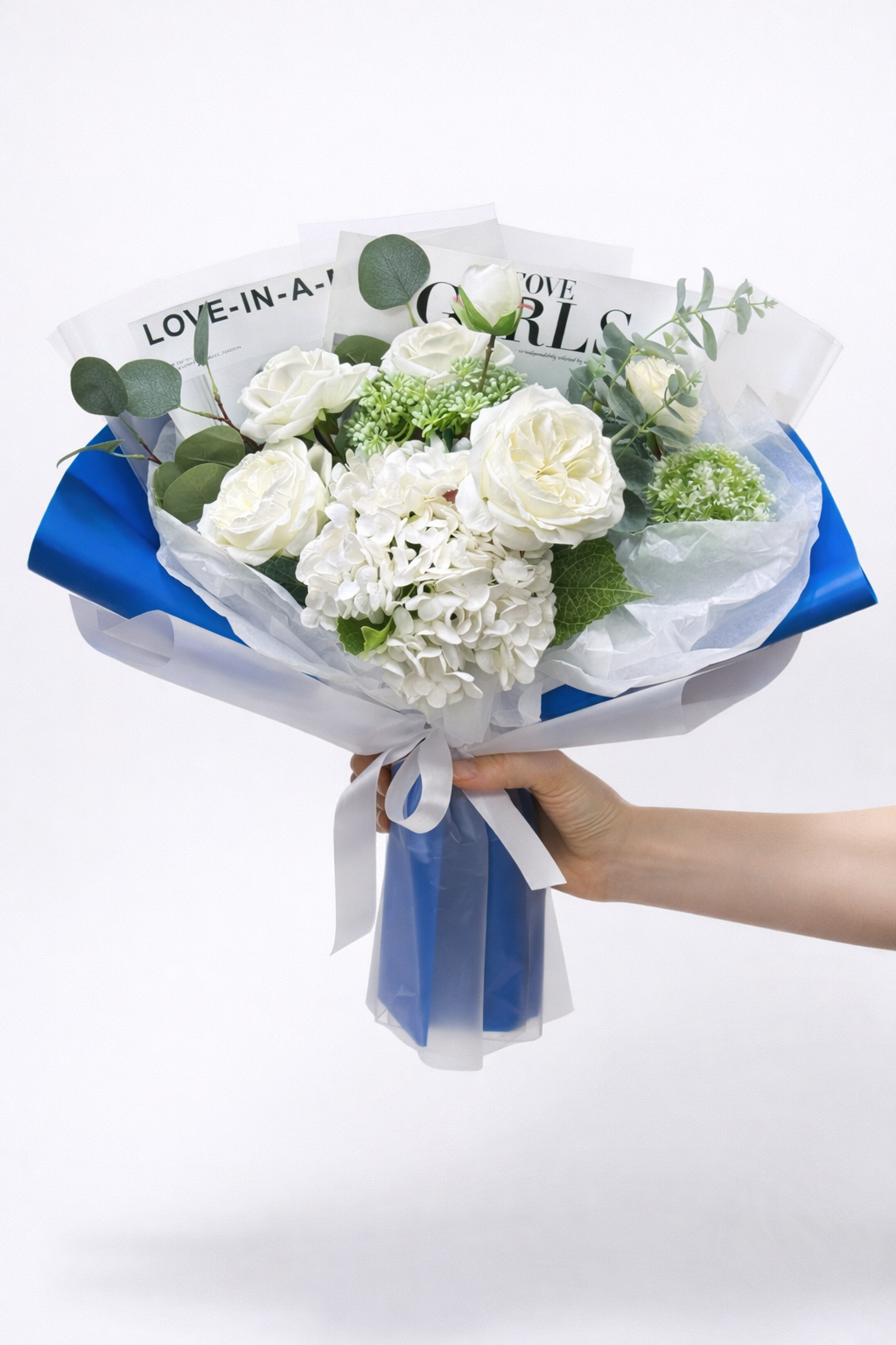 Быстро сборная упаковка в пленке. Форма №4 Коллекция "Гламур". Цвет: СИНИЙ. Размер букета: +/- в55, ш50