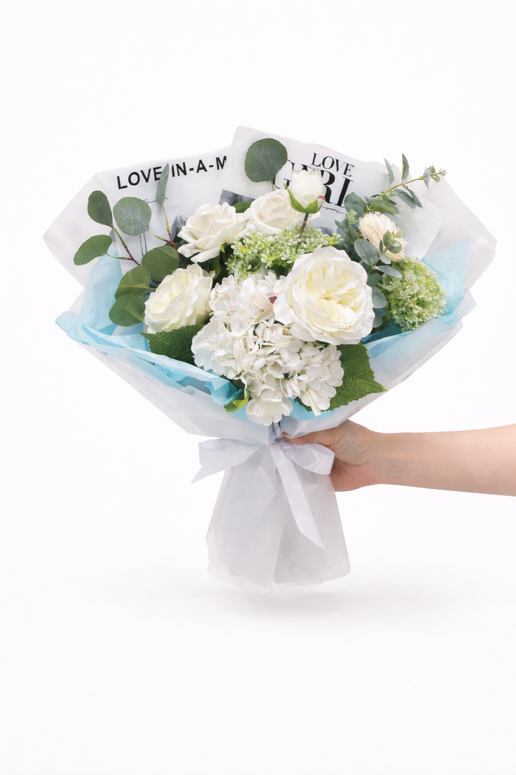 Быстро сборная упаковка в пленке. Форма №5 ГЛАМУР. Цвет: МАТОВАЯ пленка с ГОЛУБОЙ тишью. размер букета: +/- в50, ш40