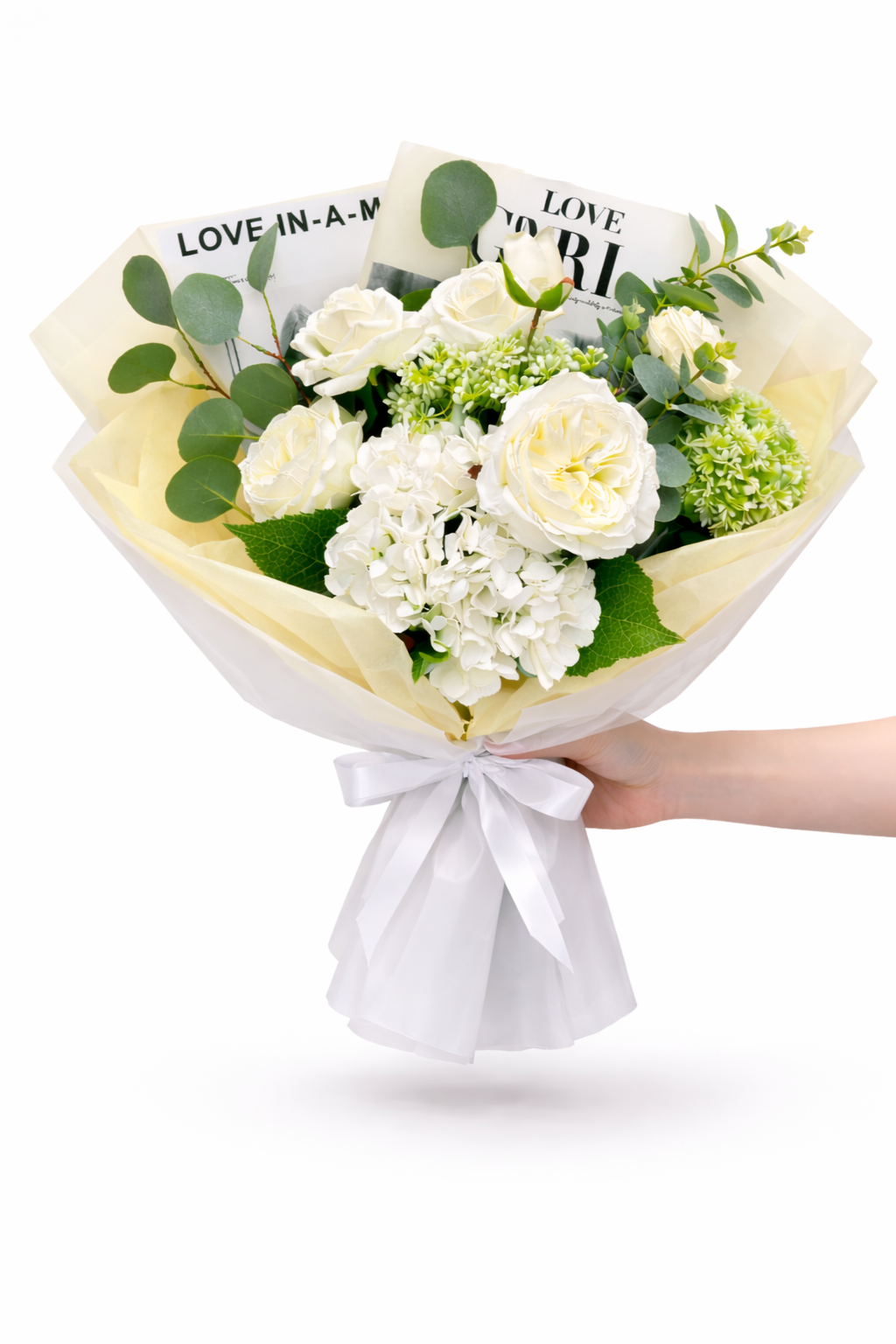 Быстро сборная упаковка в пленке. Форма №5 ГЛАМУР. Цвет: МАТОВАЯ пленка с КРЕМОВОЙ тишью. размер букета: +/- в50, ш40