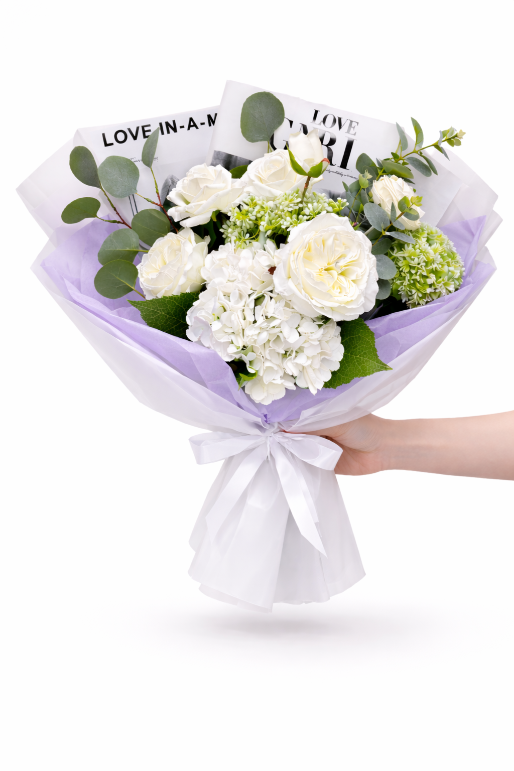 Быстро сборная упаковка в пленке. Форма №5 ГЛАМУР. Цвет: МАТОВАЯ пленка с СИРЕНЕВОЙ тишью. размер букета: +/- в50, ш40