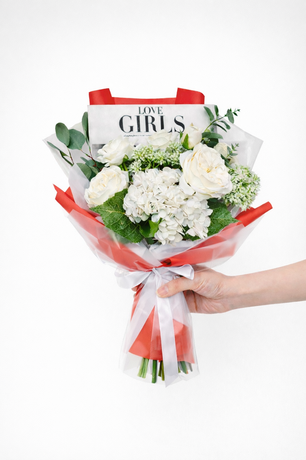 Быстросборная упаковка в пленке. Форма №2. Коллекция "Гламур". Цвет: матовая чередуется с КРАСНОЙ пленкой ,размер букета:+/- в-55,ш25