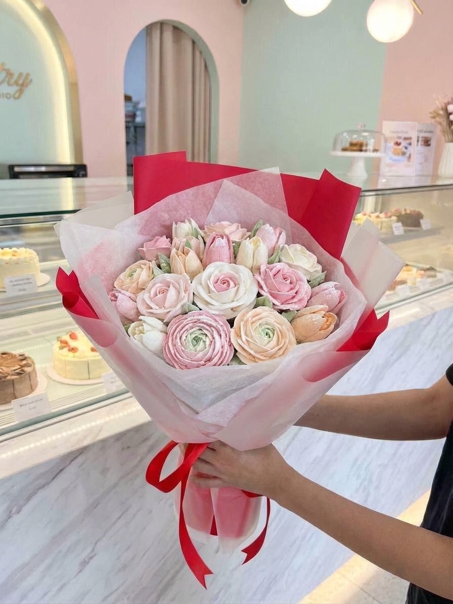 ФУД БУКЕТ Цвет: прозрачная матовая пленка + красная пленка + белым тишью