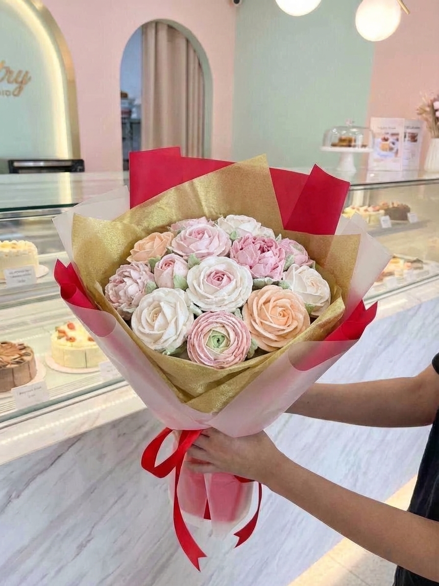 ФУД БУКЕТ Цвет: прозрачная матовая пленка + красная пленка + золотым тишью