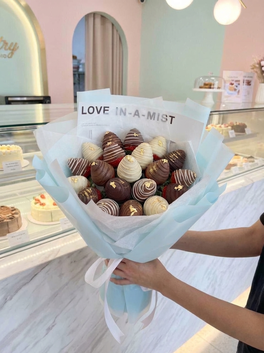 ФУД БУКЕТ Цвет: прозрачная матовая пленка + голубая пленка + тишью