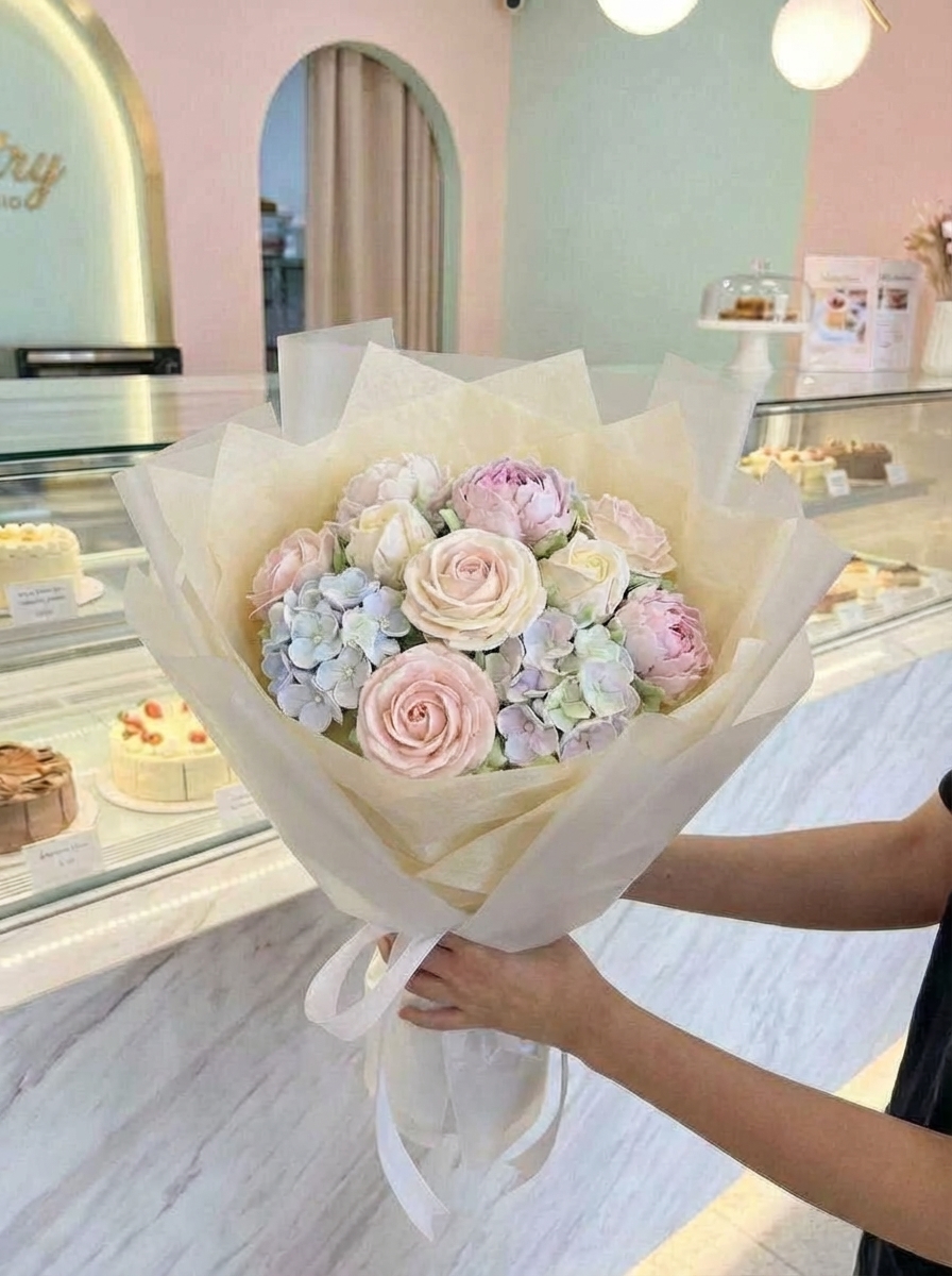ФУД БУКЕТ Цвет: прозрачная матовая пленка с кремовой тишью.