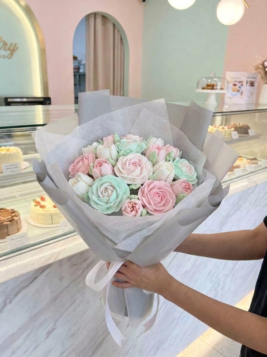 ФУД БУКЕТ Цвет: прозрачная матовая пленка + серая пленка + тишью